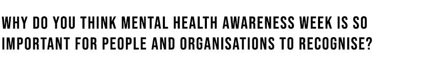 “I would love if we didn’t have a mental health awareness week because, in an ideal world, it would just be something that we all consider as normal. We don’t have a physical health awareness week because people are expected to get physically sick at times in their life, and that’s how I feel about mental health. But why I think it could be quite helpful is that if everyone’s talking about it then it promotes and highlights the importance of having those conversations, squashes the taboo, helps step away from that stigma attached to mental health issues and is seen as just a part of our colourful tapestry of life and just the way we’re all wired. Creating awareness around this will hopefully help people feel more accepted in speaking about their mental health difficulties. What I would love to see from businesses particularly is allowing employees to take time out when they do have a mental health issue, making them comfortable to be able to call up and say: “My anxiety is really high right now, I can’t make it in”, just like we might say “I’ve had severe food poisoning, I can’t make it in,” and take that as a really important indicator of somebody needing to have their rest to make their minds healthy again.”