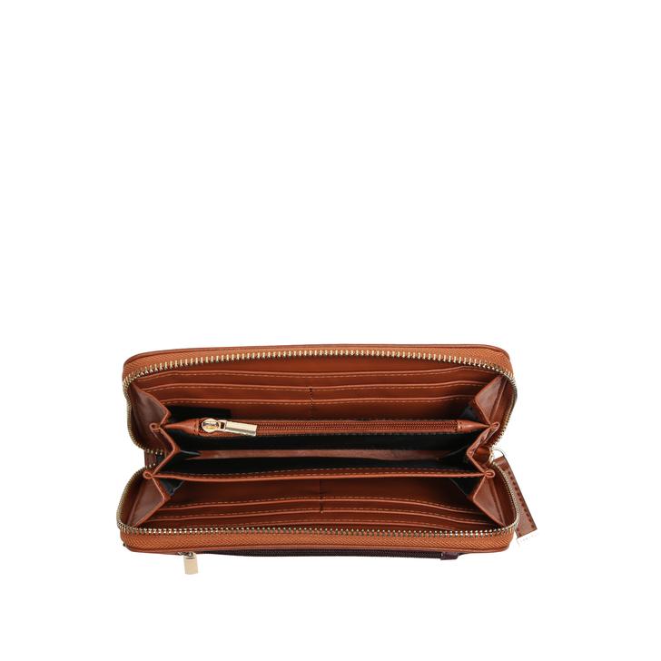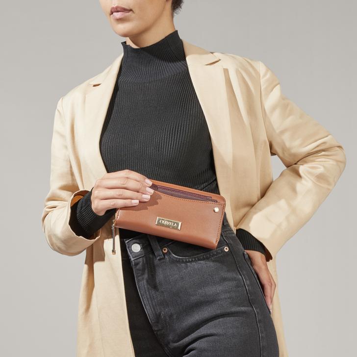 Pack up cards, cash and coins in the sleek tan style of Alia Pocket Detail Wallet. Carvela's freshest accessory offering hides a sneaky secret for extra versatility: an additional zip-top purse in contrasting wine.