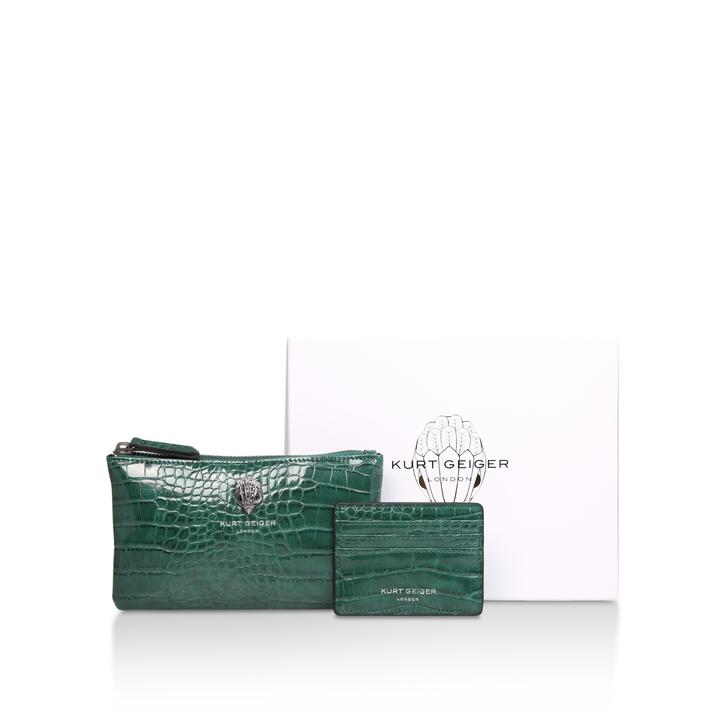 Gift shopping? Done. Your sepcial someone will be doubly delighted with the luxurious Pouch Gift Set by Kurt Geiger London. Nestled inside a premium branded box is not one, but two chic pouches in timeless teal croc print with the brands iconic eagle embellishment.