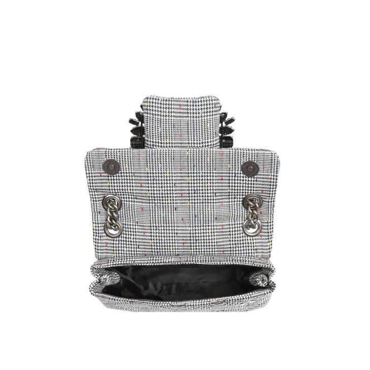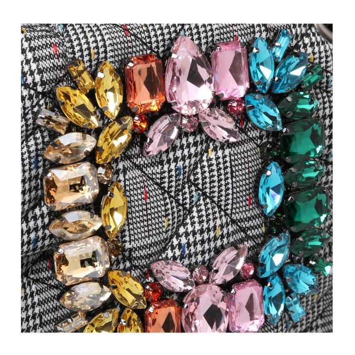 Blending trends with flair, the Fabric Mini Mayfair handbag arrives in grey fabric peppered with rainbow nods and a multi-coloured square gemstone embellishment for luxe appeal. Height: 13cm Width: 19cm Depth: 7cm.