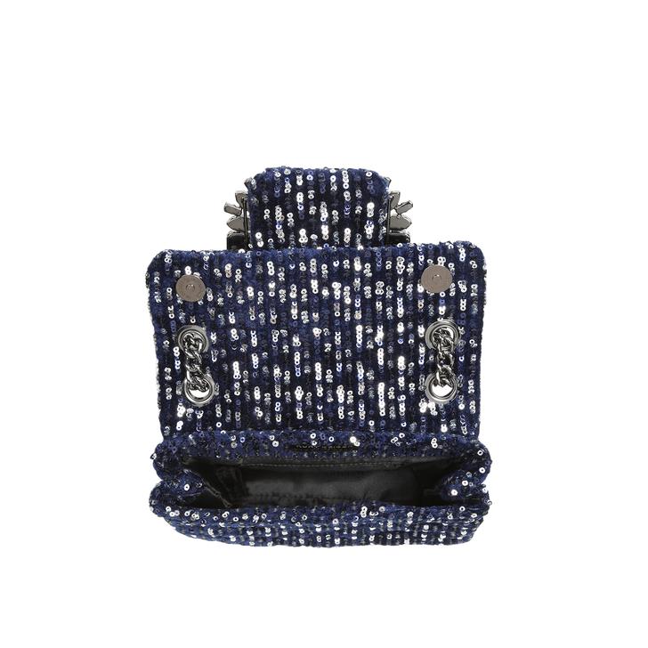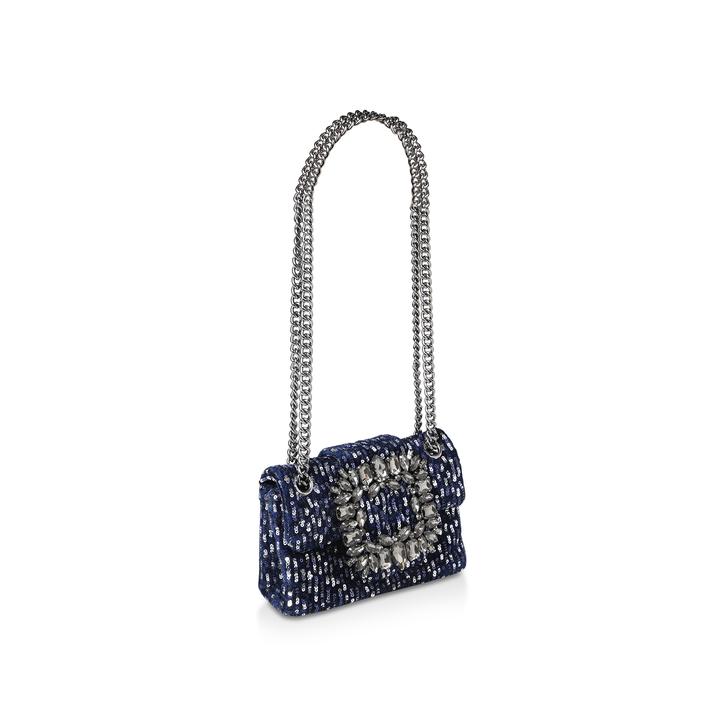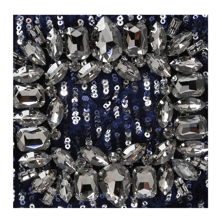 Blending trends with flair, the Velvet Mini Mayfair handbag arrives in navy fabric peppered with glistening sequins and a square gemstone embellishment for luxe appeal. Height: 13cm Width: 19cm Depth: 7cm.