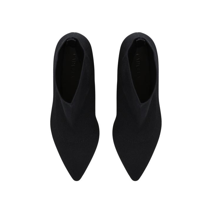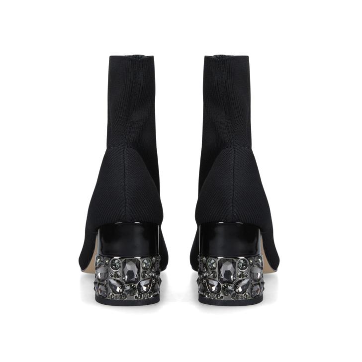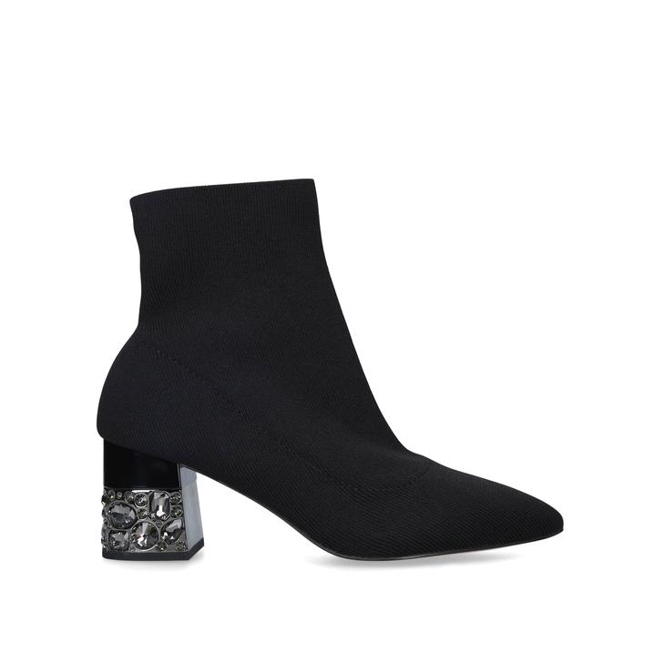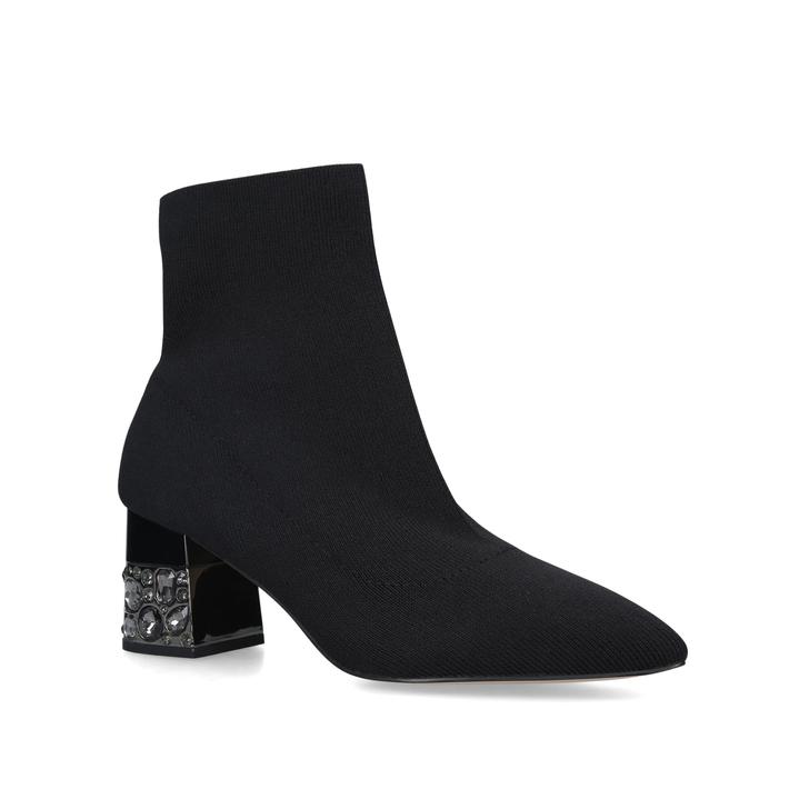 Black Sock Boots With Embellished Block Heel Secure your own take on the sock-boot trend with Kingpin from Carvela. This black ankle boot gently wraps the foot with its relaxed stretch fabric construction, and sits on an embellished block heel for a luxe style injection.