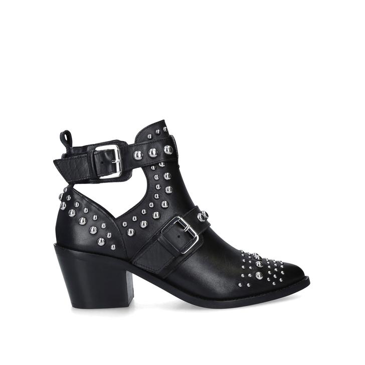 Invest in cutting-edge biker styling with the Sybil ankle boot from Kurt Geiger London. Featuring a black studded upper for directional appeal, this design is given a modern structure through cutout detailing and a chunky 60mm heel. The perfect addition to your festival attire.