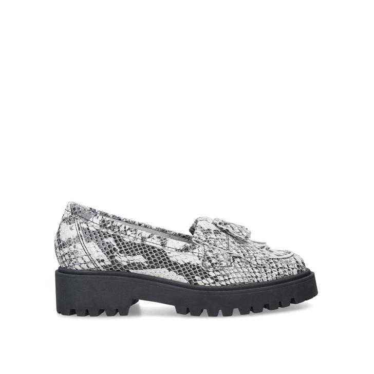 Kurt Geiger London’s Klarke Pump loafer adds a dapper edge to your collection and is crafted in snake print with a tassel. Set on a durable rubber flatform sole, this shoe is a dependable choice for both comfort and style.