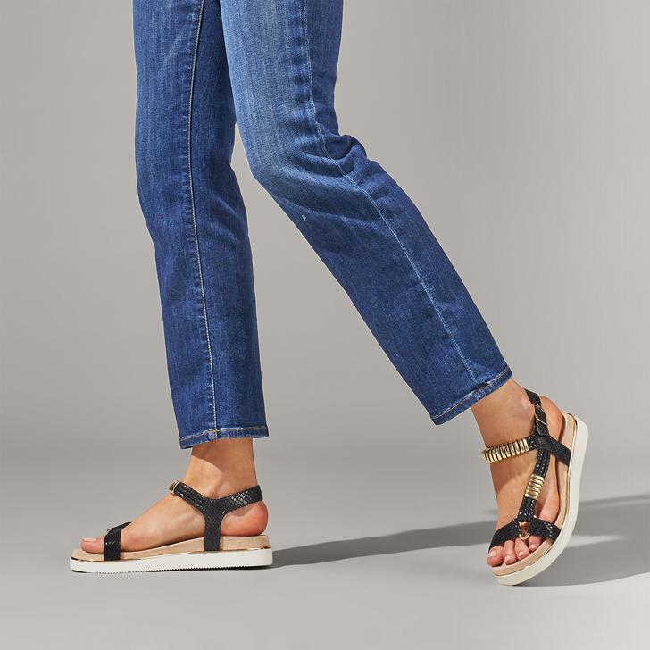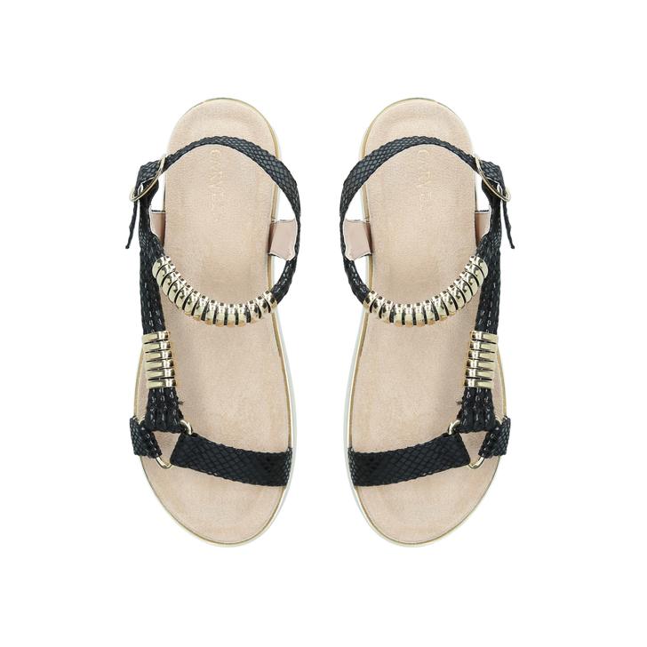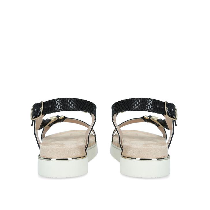 Set in an embossed black, the Boujee sandal by Carvela offers plenty of designer style with guaranteed comfort through its contoured footbed. Featuring gold trims to amp up the luxe, this design is finished with a buckled ankle strap for a secure fit.