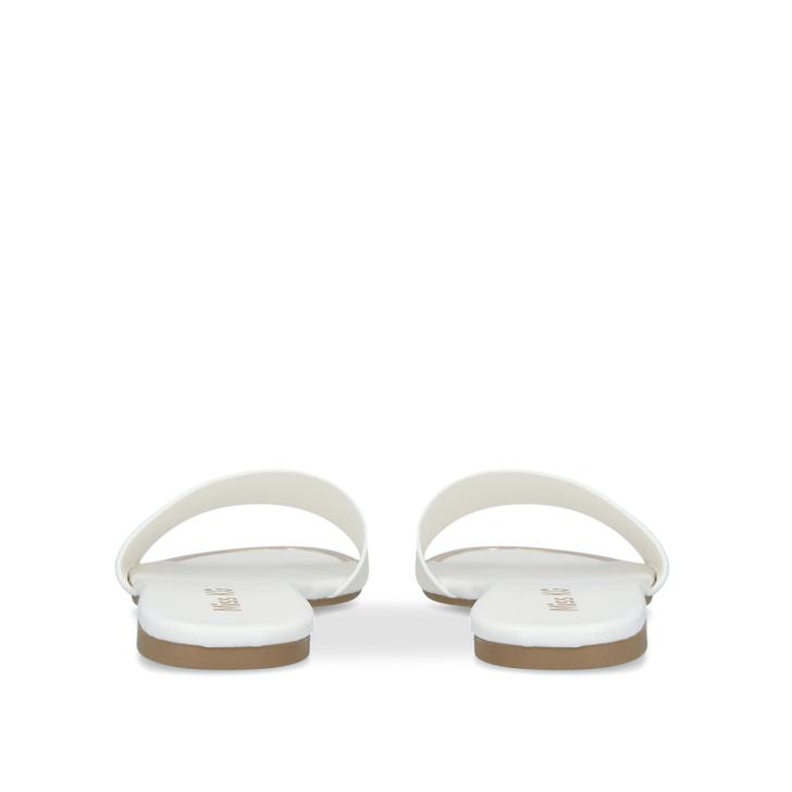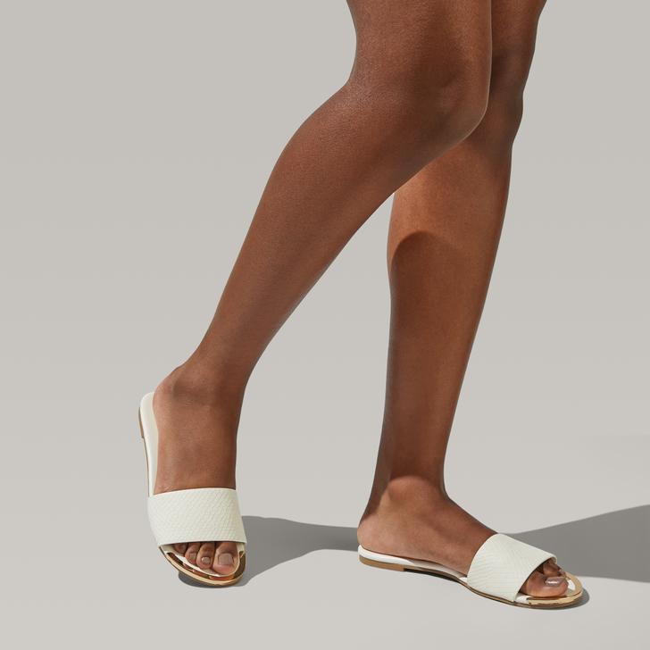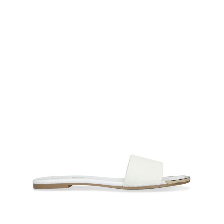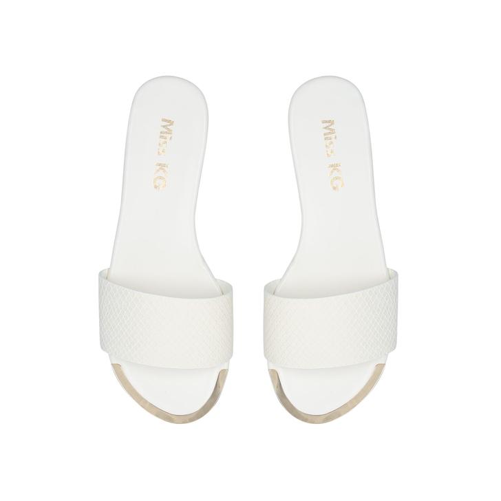 Miss KG puts a minimal-fuss spin on a footwear classic to bring you Zelda. Styled with a white strap featuring a chevron pattern, this slider is supported by a flat sole with a golden highlight at the toe as a chic signoff.