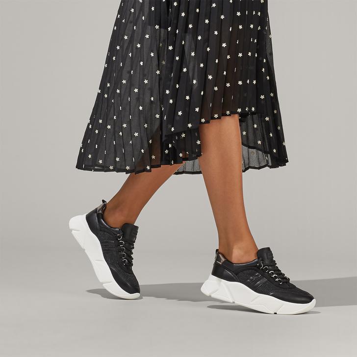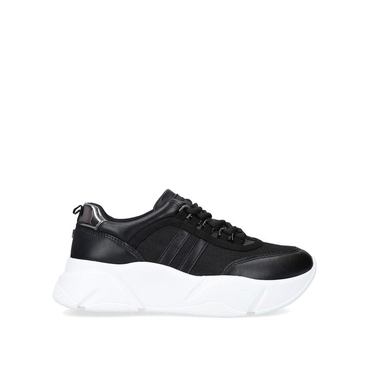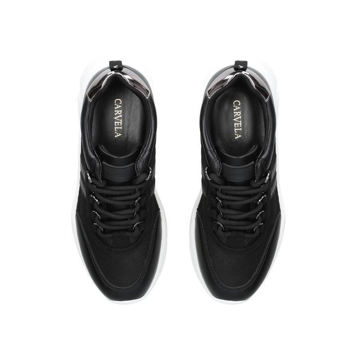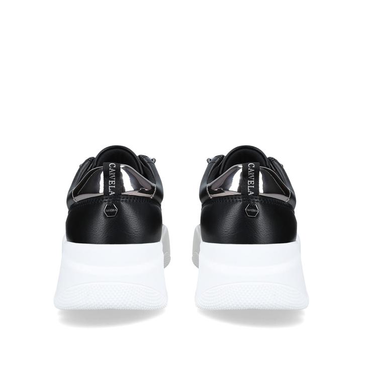 Carvela presents Lassitude: an easy-wear black trainer for your athleisure collection. This style is given a modern upgrade through a platform sole in contrast white and a metallic trim at the heel tab for a luxe signoff.
