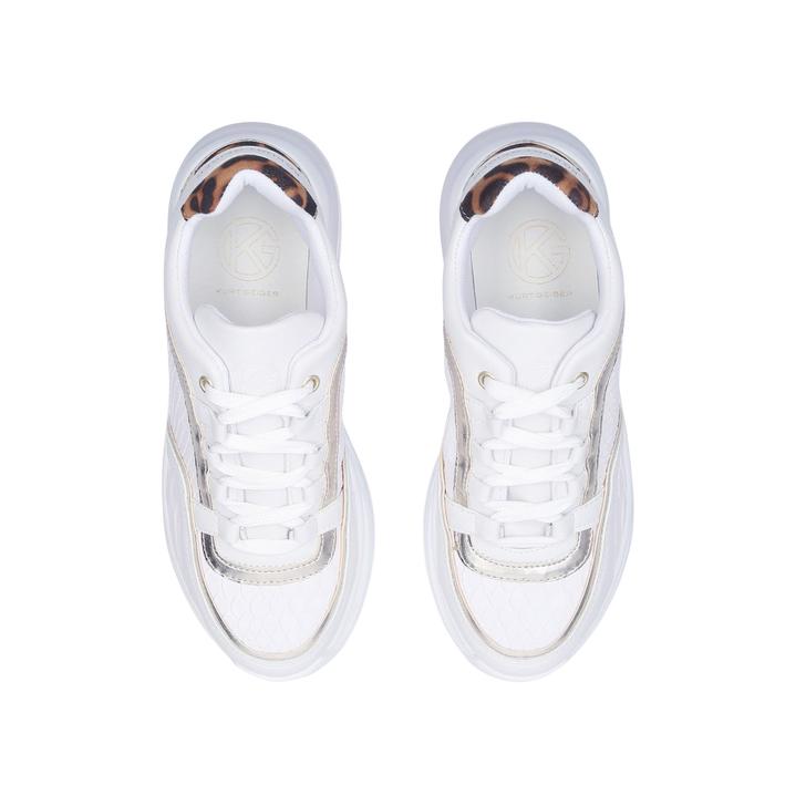 Taking sports luxe up a few notches, KG Kurt Geiger presents Lizzy for your athleisure capsule. With a chunky 20mm cleated sole, this trainer is delivered in white with gold piping and a branded animal-print heel tab for an ultra-glam finish.