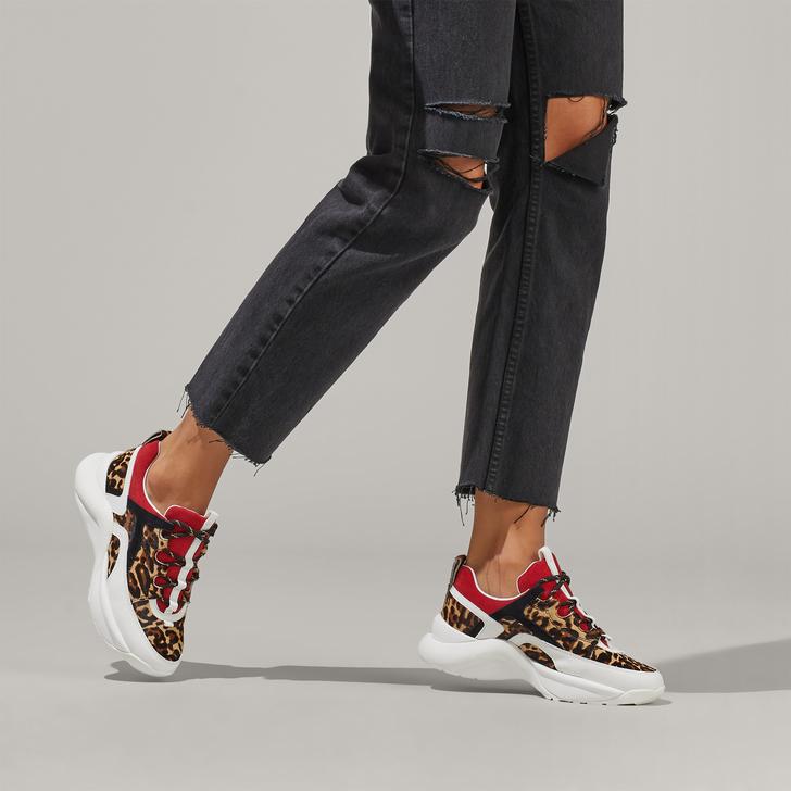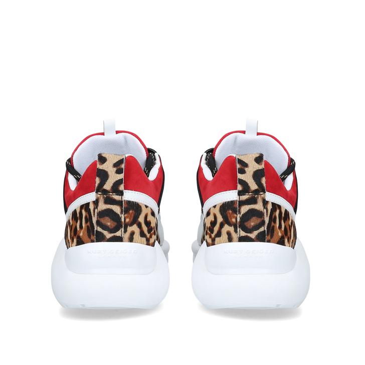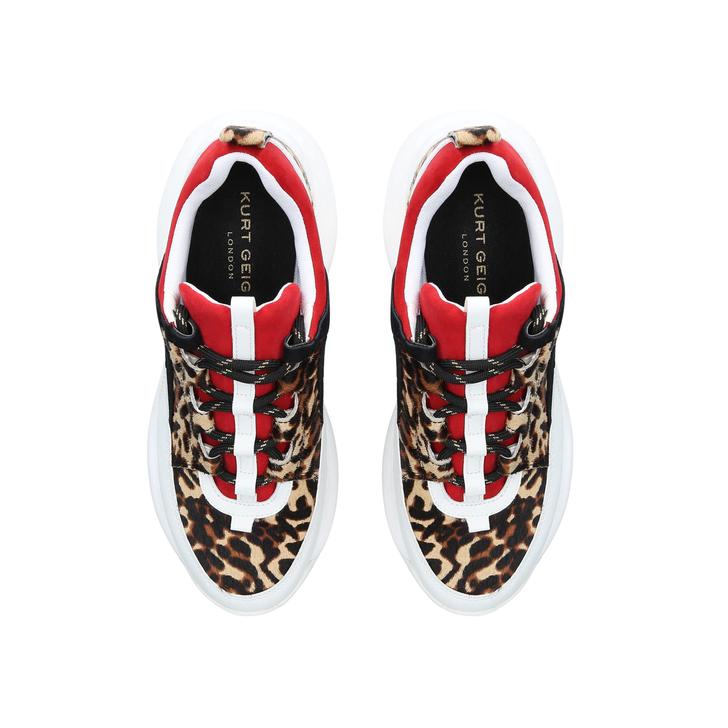 Make like the models and invest in a pumped-up trainer silhouette for the new season. Set on a springy rubber outsole with a cushioned insole for comfort, Kurt Geiger London's Lunar trainers feature leopard print hair calf panels, offset by monochrome overlays and hits of bold red.
