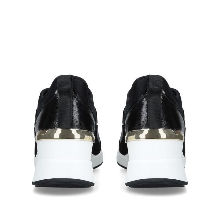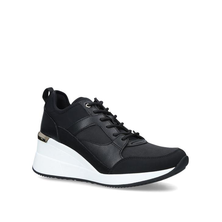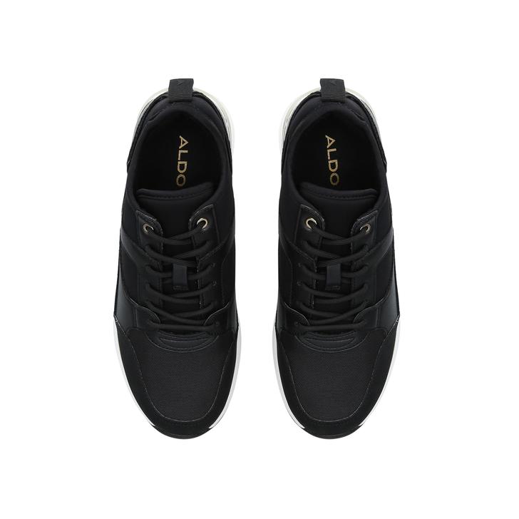 ALDO takes a feminine approach to the classic trainer in the Thrundra low-top. Created with a black, mixed-material upper, this ultra-chic trainer is supported by a wedged 50mm white sole with a flash of mirroring at the heel.