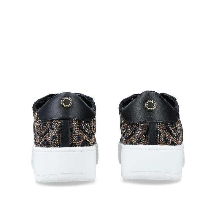 Putting an ultra-modern edge on a footwear classic, Belle-R trainer is the latest sports-luxe offering from Steve Madden. Created with a mixed-material upper with a micro-stud animal motif, this trainer rests on a boosted sole in white.